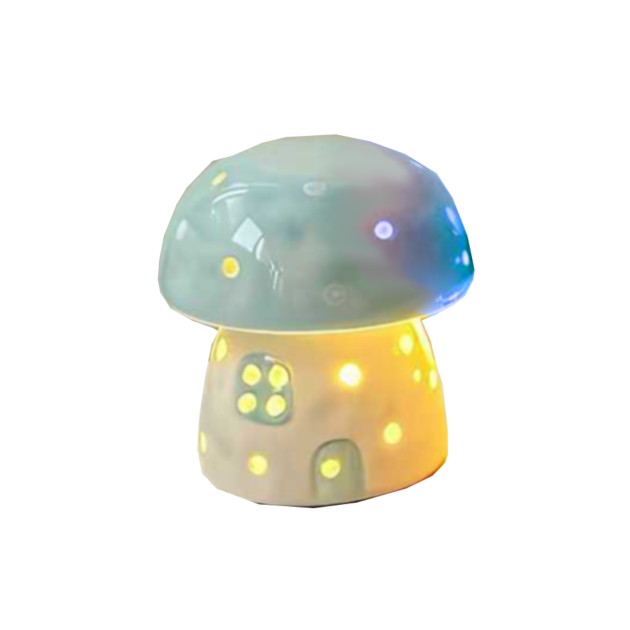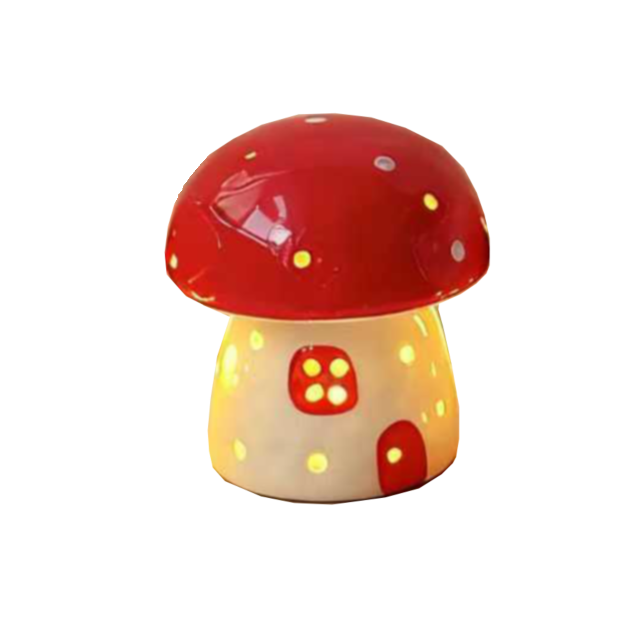 The lamp body is made of high-quality ceramic, carefully fired to showcase a smooth, glossy finish. The mushroom caps come in different shades, paired with a base featuring tiny windows, recreating the look of a fairy-tale house. When lit, warm light shines through the 'doors and windows' as well as the dotted spots, giving the impression of a cozy hearth inside the mushroom house. Its compact size makes it suitable for placement on desks, bedside tables, and other spots, covering the ambient decor and soft lighting needs of bedrooms, children's rooms, and more.