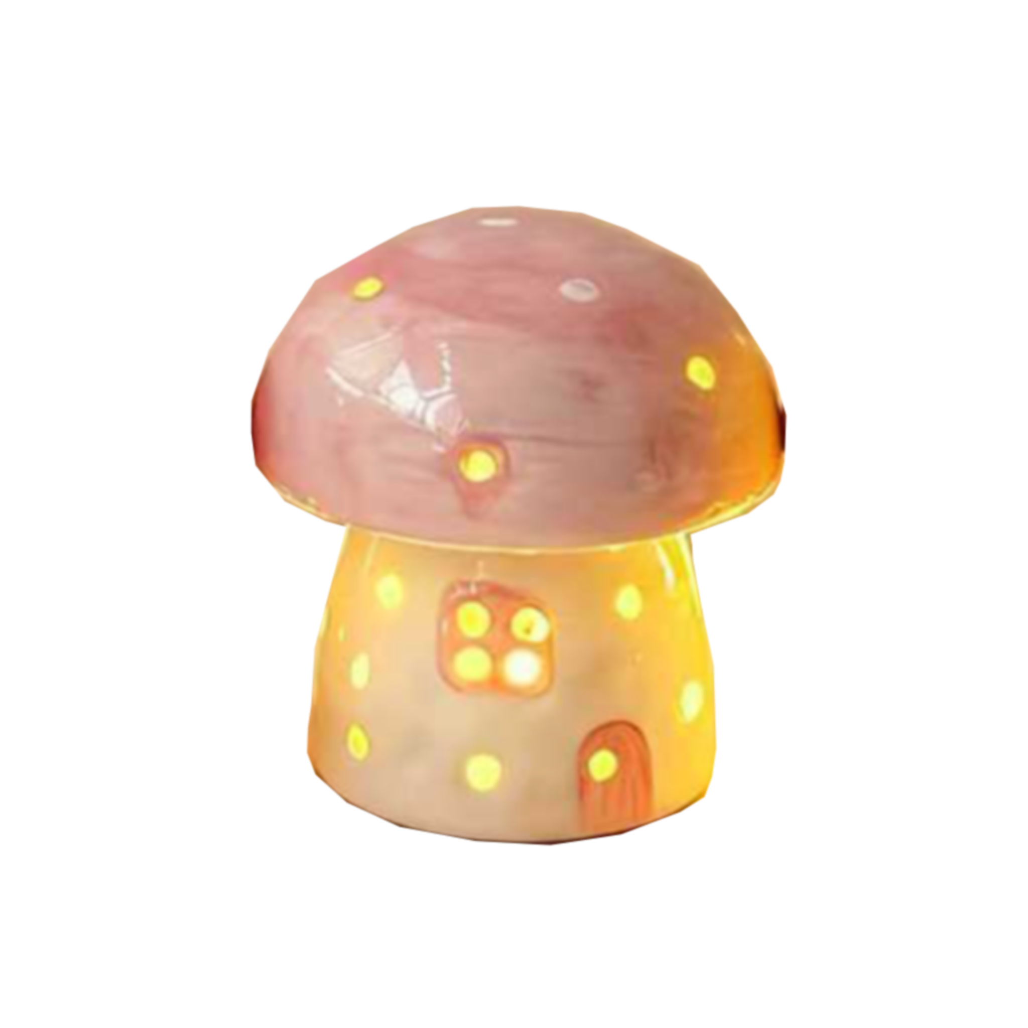 This 'Cute Little Mushroom Ceramic Lamp' is designed based on a fairy-tale mushroom house, featuring pastel-colored tones and miniature door and window decorations, merging a playful, heartwarming charm with the delicate texture of ceramic, creating a naturally dreamy atmosphere.