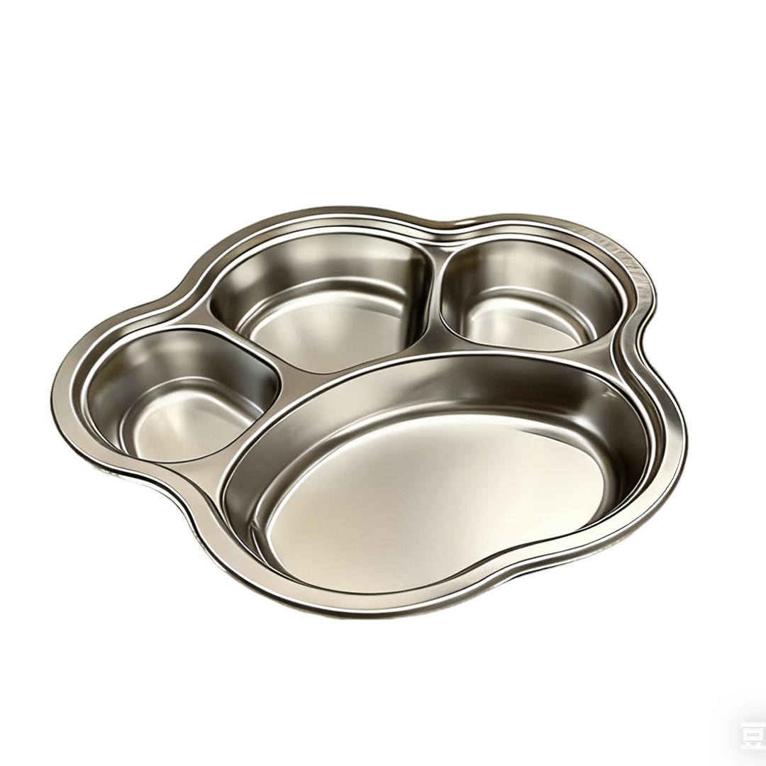 This "Cute Pet Paw Stainless Steel Plate" features an adorable paw print design as its core concept, made from food-grade stainless steel, blending playful creativity with practical functionality, and naturally exuding a comforting vibe.The plate replicates the rounded contours of a pet’s paw, divided into 3 small compartments and 1 main compartment, allowing for separate serving of meals or snacks, as well as use as a sauce dish combo. The shiny stainless steel surface is easy to clean and corrosion-resistant, suitable for dining tables, picnics, and more. The cute paw print design breaks the monotony of traditional tableware, giving it an inherently "soft and cute" charm.It fits well in cute or lightly vintage-themed lifestyles, serving not only as a practical meal-sharing plate or seasoning dish but also as a fun decoration on the dining table. Whether adding a touch of joy to everyday meals or creating a playful atmosphere for picnic dining, it combines practicality with cuteness, making it a delightful item that adds fun to life's little details.
