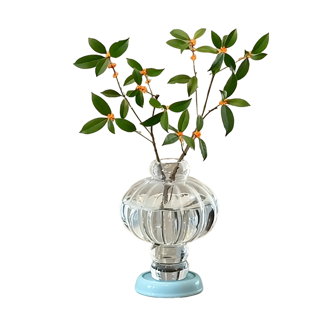 This 'Chinese-Style Transparent Lantern Glass Vase' is designed around the traditional lantern shape, paired with a transparent glass body and a light blue base, blending Chinese charm with floral aesthetics, naturally exuding an elegant atmosphere.The vase is made of high-transparency glass, with a lantern-style rounded silhouette and vertical textures, which not only reflect the classical charm of traditional objects but also highlight the natural beauty of flowers through its clear material. The design features a narrow mouth and a wide body, suitable for arranging various flower stems, while the light blue base adds a fresh and soft visual layer.It complements modern Chinese and Zen-style home decor, serving both as a practical flower vase and a decorative piece. Whether displaying Chinese flowers like osmanthus or wintersweet, or used as a container for dried flowers to adorn a table, it combines aesthetic appeal with practicality, making it a stylish Chinese-style item to enhance the elegance of everyday life.