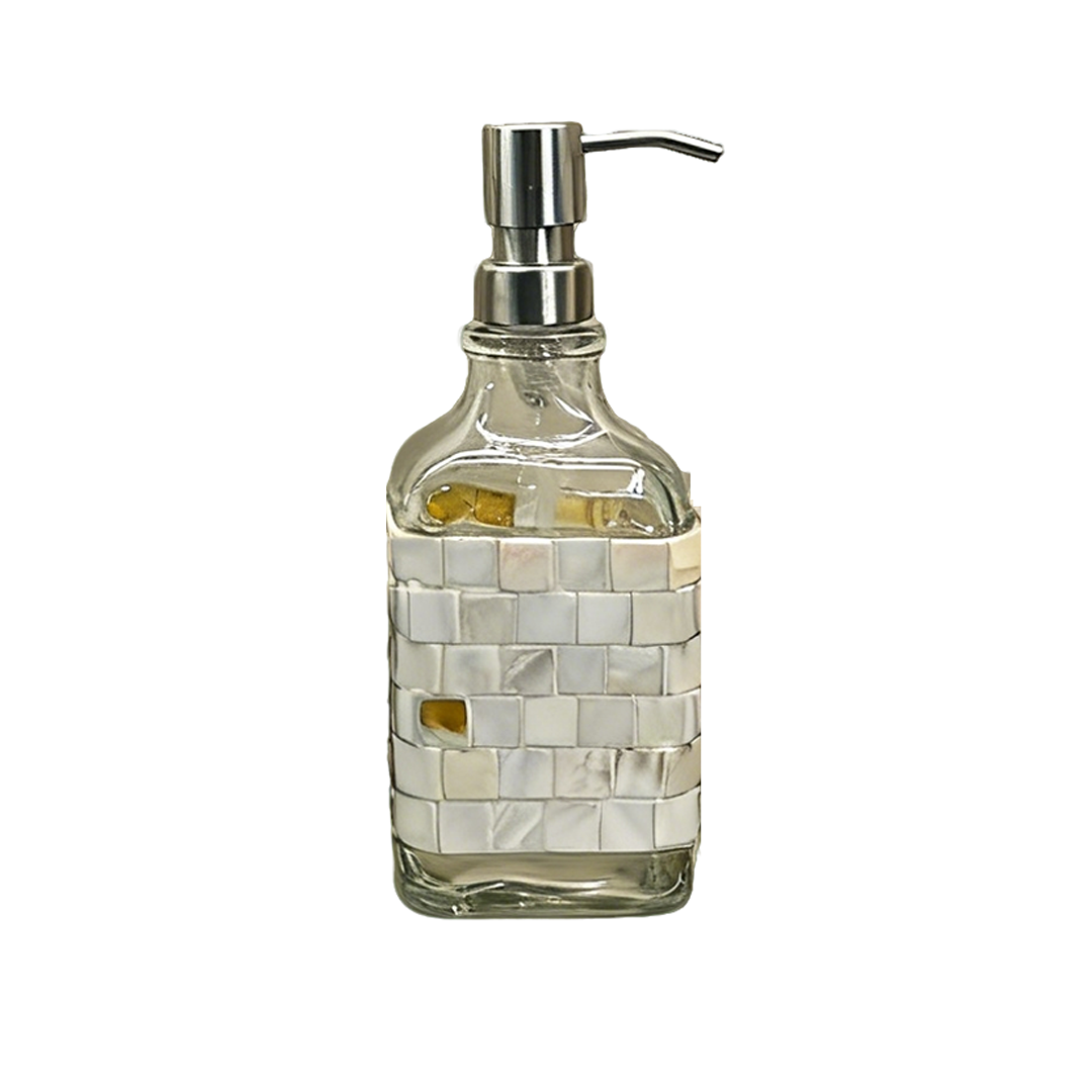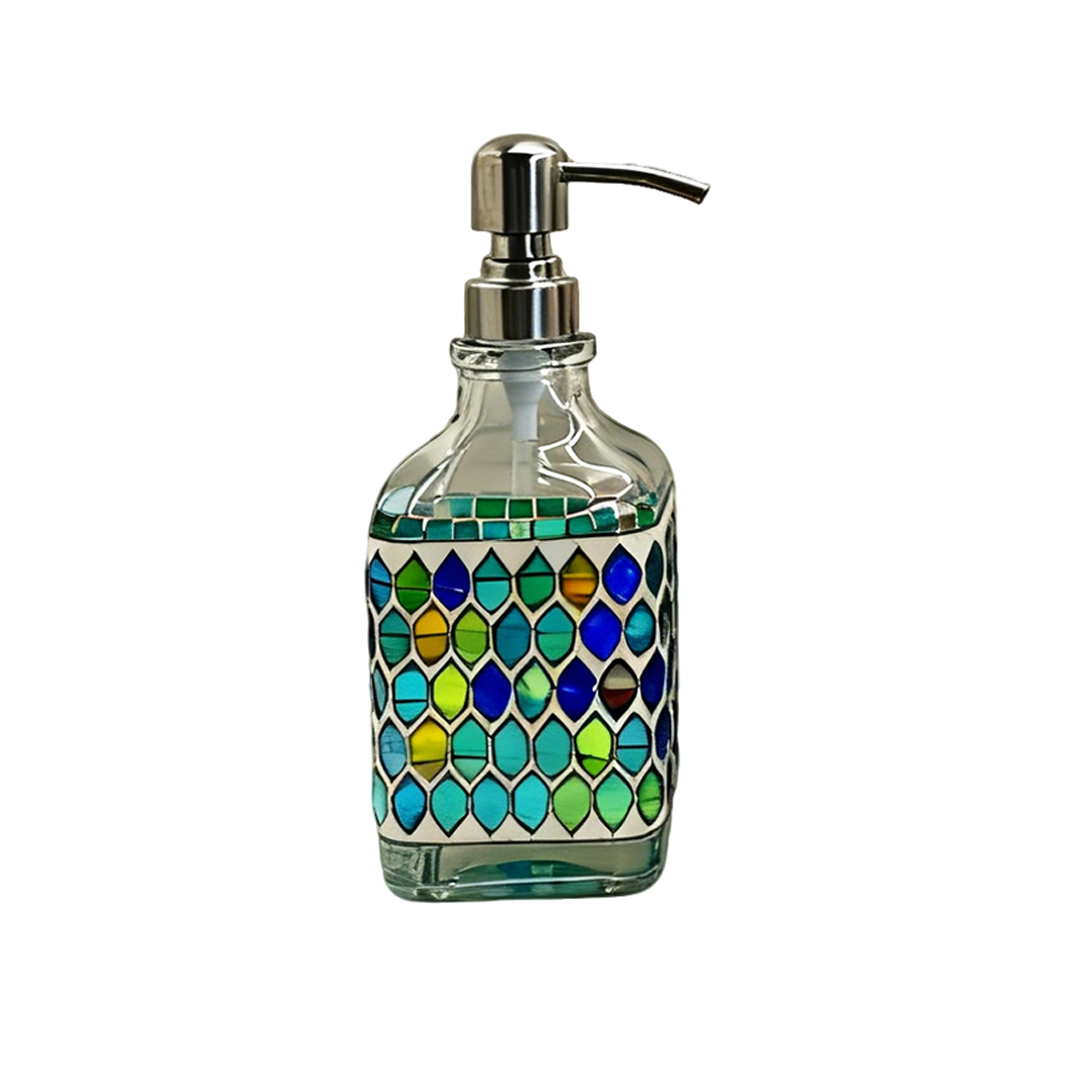 This 'Color Block Mosaic Bath Glass Bottle' centers on handcrafted mosaic design, paired with a transparent glass and metal pump, blending artistic texture with practical functionality while naturally bringing a lively atmosphere.The bottle is made from high-transparency glass as the base, with hand-applied mosaic pieces in various colors: a blue-green gradient for a dynamic look, black-and-white geometric for a minimalist style, milky white texture for a gentle touch, and pink-yellow contrasting colors for a playful vibe. Each version resembles a miniature art installation. The matte metal pump is smooth to press and complements the bottle's texture, with a capacity suitable for shower gel, hand soap, and other personal care products.It fits well in Bohemian or artistic-style bathrooms, serving both as a practical container for bath products and a decorative item with character. Whether arranged together to create a visual focal point in the bathroom or used individually to accent a countertop, it combines practicality with artistry, making bath products a creative part of your décor.