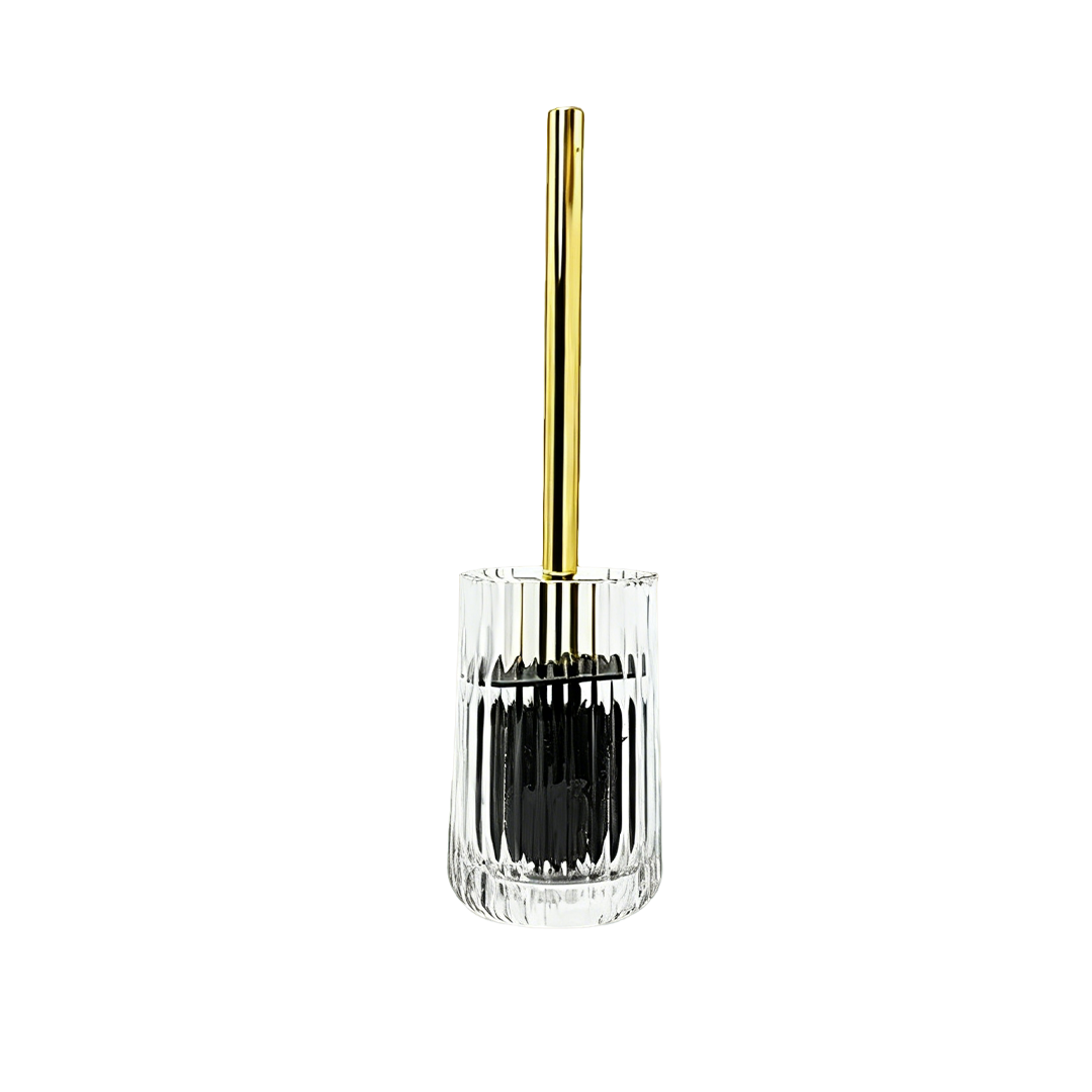 This "Vertical Glass Toilet Brush Holder" features a combination of transparent vertical glass and a gold-colored brush handle, breaking the traditional cheap feel of toilet brushes. It blends a sense of understated luxury with practical functionality, making it a refined item for the bathroom space.The holder is made of high-transparency glass, with fine vertical textures on the surface that refract light to create a delicate layered effect. The transparent quality softens the 'functional' impression of a cleaning tool, making it more like a decorative piece. Paired with the glossy gold handle, it creates a subtle luxurious contrast with the glass body. The brush head uses black soft bristles, which are strong in cleaning power and resistant to holding dirt.It fits well in bathrooms with a light luxury or French style, serving as both a practical toilet cleaning tool and a stylish accent that elevates the bathroom's aesthetic. Whether placed next to the toilet or as a small decorative element in a bathroom corner, it balances utility and beauty, making it a refined item that allows cleaning tools to exist gracefully.
